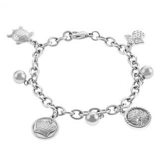 STAINLESS STEEL BRACELET WITH 4 CHARMS IN DIFFERENT DESIGNS AND 3 STEEL BALL IN 8MM. THE HANGING CHARMS SIZES FROM 12MM-18MM WIDTH