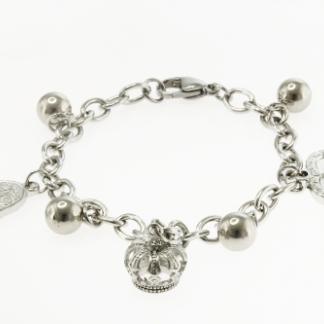STAINLESS STEEL BRACELET WITH 3 CHARMS AND 4 STEEL BALLS. ALL IN SS COLOR
