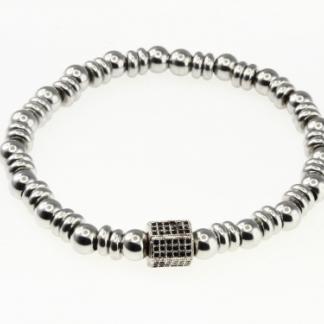 STAINLESS STEEL ELASTIC BRACELET WITH STEEL BEADS AND ONE COPPER BEADS WITH BLACK AND WHITE ZIRCON IN THE CENTER