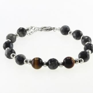 STAINLESS STEEL BRACELET WITH LABRADORATE STONE IN DIAMOND CUT SHAPE AND 2 TIGER EYE STONE AND STEEL BALLS