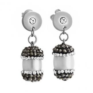STAINLESS STEEL STUD/DROP EARRING WITH 1 CIRCLE & CZ CENTER PIECE & S/S LIKE RUGBY BALL WITH BLACK & WHITE CZ AT EACH END ALL IN S/S COLOR