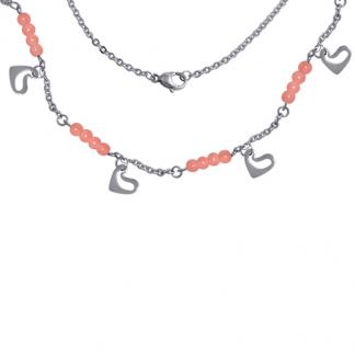 STAINLESS STEEL NECKLACE WITH 4 SET ROSE CORAL PEARL WITH 4 CHARM IN HEART SHAPE
