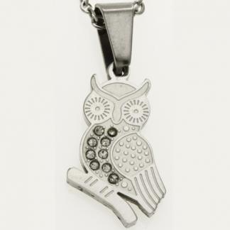 STAINLESS STEEL NECKLACE ALL IN STEEL COLOR WITH OWL PENDANT WITH CZ