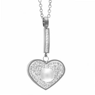 STAINLESS STEEL NECKLACE WITH HEART SHAPE PENDANT (LONG) FILLED WITH CZ AND A BIG PEARL IN CENTER ALL IN S/S COLOR