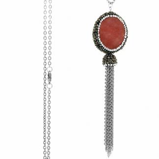 STAINLESS STEEL NECKLACE WITH RED STONE WITH BLACK & WHITE CZ AND A CASCADE OF THIN CHAINS ALL IN S/S COLOR