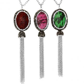 STAINLESS STEEL NECKLACE WITH PENDANT NATURAL STONE AND CRYSTAL BLACK & WHITE WITH THIN CHAIN IN CASCADE IN S/S COLOR