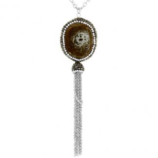 STAINLESS STEEL NECKLACE WITH PENDANT NATURAL STONE BROWN AND CRYSTAL BLACK & WHITE WITH THIN CHAIN IN CASCADE IN S/S COLOR