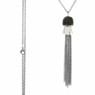 STAINLESS STEEL NECKLACE WITH BLACK & WHITE CZ PENDANT WITH WHITESWAROVSKI CRYSTAL & THIN CHAIN IN CASCADE ALL S/S COLOR