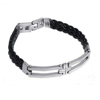 STAINLESS STEEL BRACELET WITH BLACK LEATHER WITH CROSS AT CENTRE