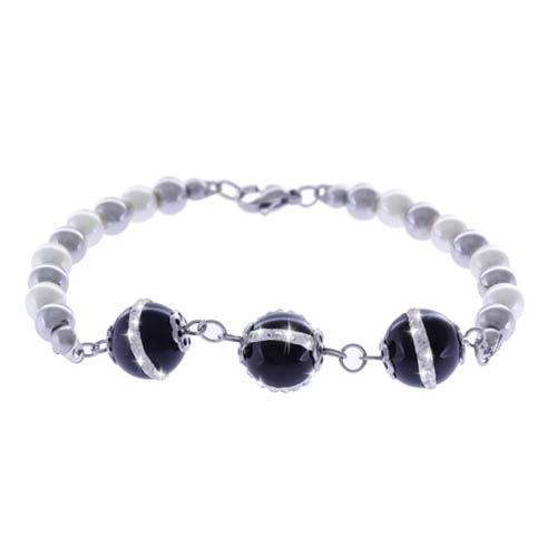 STAINLESS STEEL BRACELET WITH STEEL & PEARL BEADS WITH 3 BLACK ONXY WITH CZ