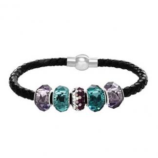 STAINLESS STEEL BRACELET WITH LEATHER & MAGNET LOCK WITH ROUND CZ PENDANT IN CENTER WITH TWO GREEN & TWO PURPLE CRYSTAL