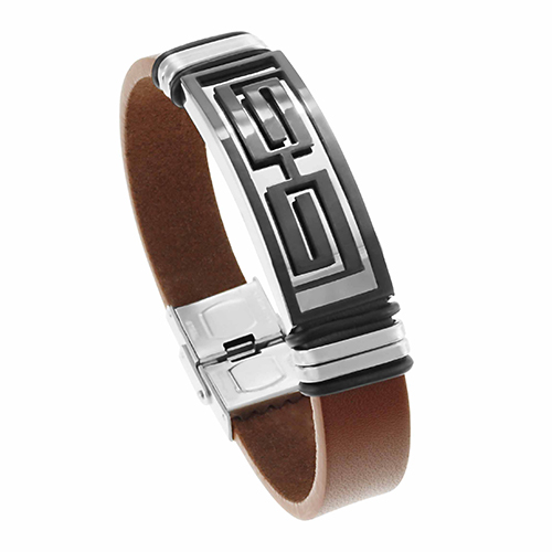 STAINLESS STEEL BRACELET WITH BROWN LEATHER. THE ID PLATE IN IPB TWO TONE