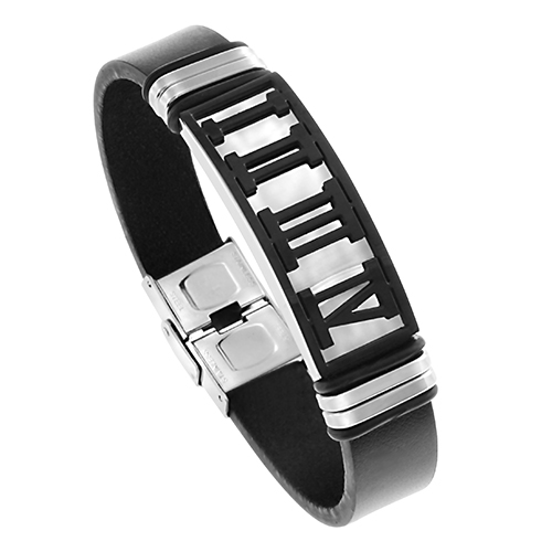 STAINLESS STEEL BRACELET WITH BLACK LEATHER. THE ID PLATE IN IPB TWO TONE