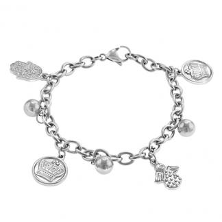 STAINLESS STEEL BRACELET WITH 4 CHARMS IN DIFFERENT DESIGNS AND 3 STEEL BALL IN 8MM. THE HANGING CHARMS SIZES FROM 12MM-18MM WIDTH