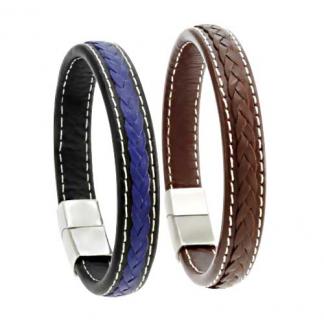STAINLESS STEEL BRACELET WITH BLACK AND BLUE TWO TONE LEATHER