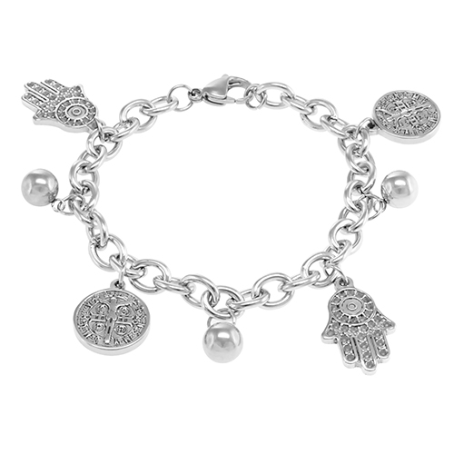 STAINLESS STEEL BRACELET WITH HAND AND SAN BENITO CHARMS ALL IN SS COLOR.