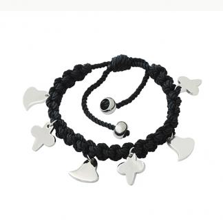 Stainless Steel Bracelet Black cotton string with 3pcs hanging heart & 3pcs hanging cross