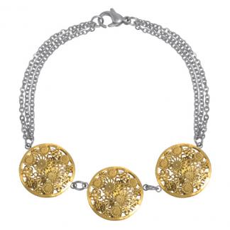 Stainless Steel Bracelet WITH THREE CIRCLES OF FLOWER PATTERN WITH CZ INSIDE IN IPG TWO TONE