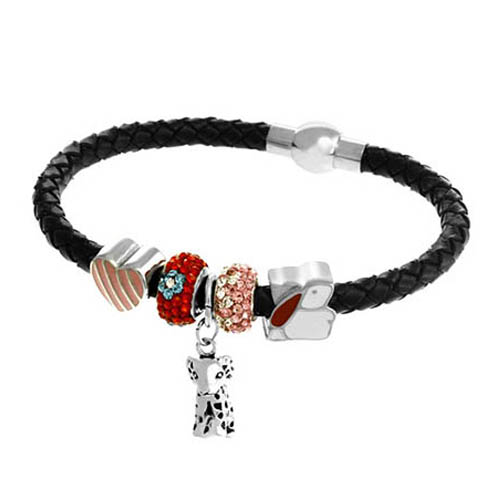 | STAINLESS STEEL BRACELET WITH LEATHER & MAGNET LOCK WITH HEART BEAD WITH 2 ROUND CZ PENDANT WITH RABIT BEAD WITH DOG CHARM |