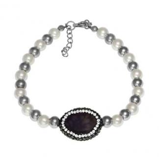 STAINLESS STEEL BRACELET WITH BROWN STONE AS CENTER PIECE WITH BLACK & WHITE CZ AROUND IT WITH PEARLS & S/S BEADS S/S COLOR