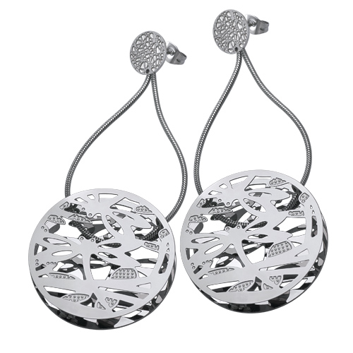 STAINLESS STEEL EARRING WITH ROUND PIECE WITH DRAGONFLY PATTERN= ALL IN STEEL COLOR