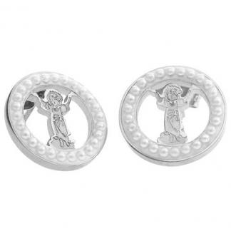 STAINLESS STEEL EARRINGS IN ROUND SHAPE WITH PEARL WITH ANGEL LASER PATTERN