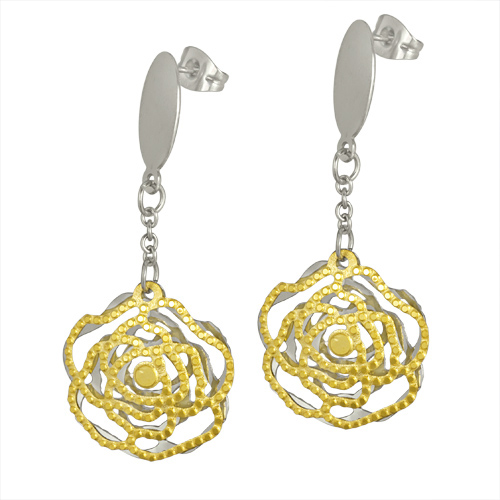 STAINLESS STEEL EARRING WITH FLOWER SHAPE WITH CUTOUT PATTERN IN IPG TWO TONES
