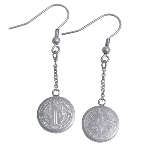 STAINLESS STEEL DANGLE EARRING WITH SAN BENITO CIRCLE PIECE (TWO SIDES DIFFERENT)ALL IN STEEL COLOR