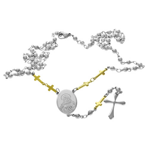 | STAINLESS STEEL ROSARY NECKLACE IN IPG TWO TONE NECKLACE WITH IPG CROSS WITH OVAL PENDANT WITH MOTHERS IMAGE IN S/S COLOR |