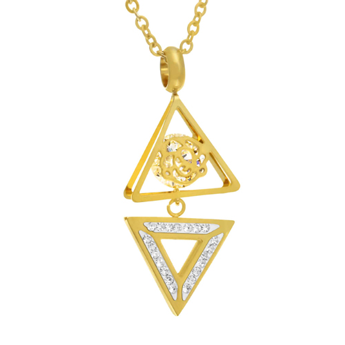 STAINLESS STEEL NECKLACE TWO TRIANGLES WITH A ROSE WITH CZ JOINED TOGETHER WITH A SMALL HOOP ALL IN IPG