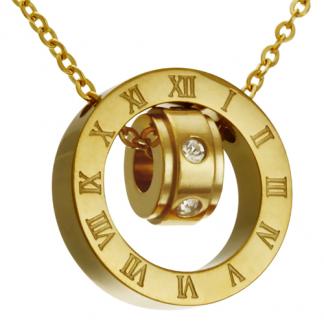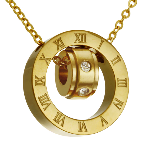 STAINLESS STEEL NECKLACE WITH CIRCLE PENDANT TWO WITH SCREW PATTERN AND CZ IN IPG COLOR.