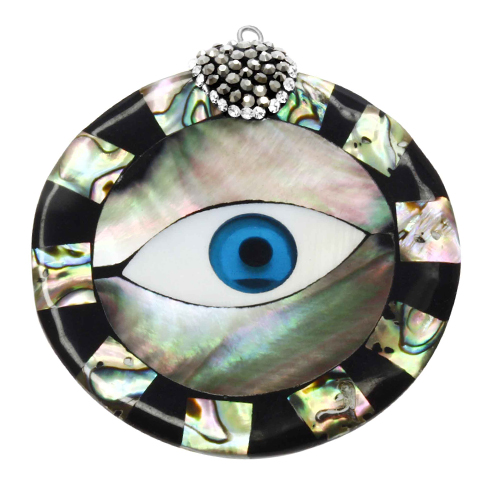 STAINLESS STEEL PENDANT IN CIRCULAR SHAPE WITH A PSYCHEDELIC DESIGN OF A EYE IN THE CENTER IN ENAMEL BLACK WITH BLACK & WHITE CZ ALL IN S/S
